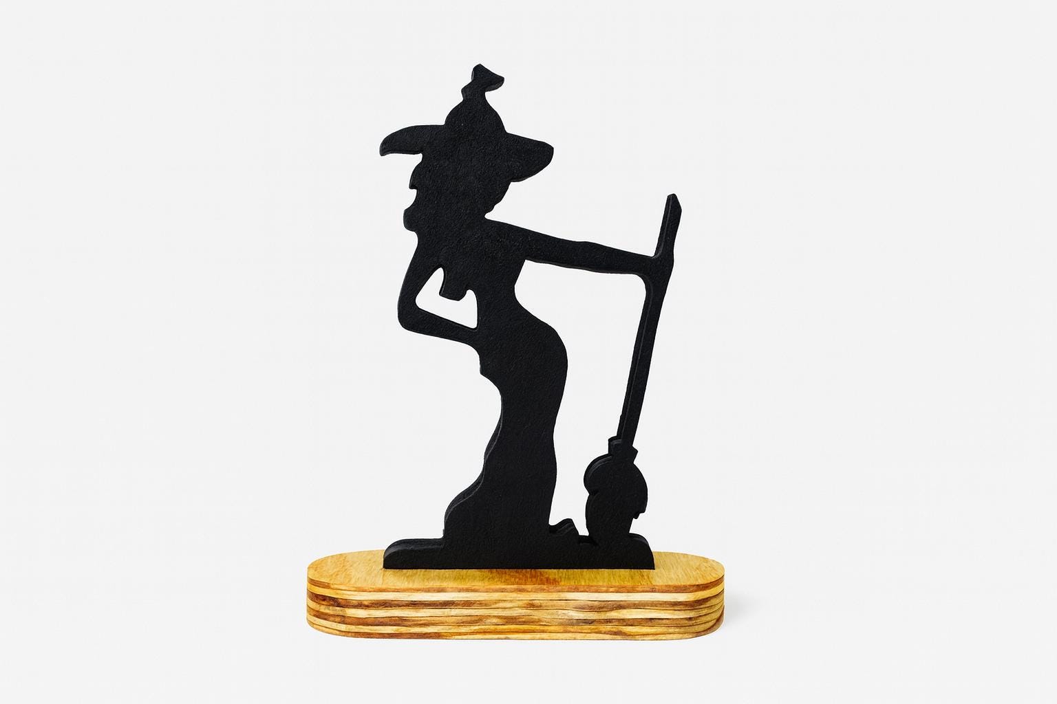Bring some playful witchy charm to your Halloween display with this sassy wooden witch silhouette! With one hand on her hip and the other resting on her broomstick, this confident little cutout is full of personality. Crafted from black-painted wood and mounted on a sturdy natural base, she’s perfect for your tiered tray, mantel, shelf, or spooky centerpiece.