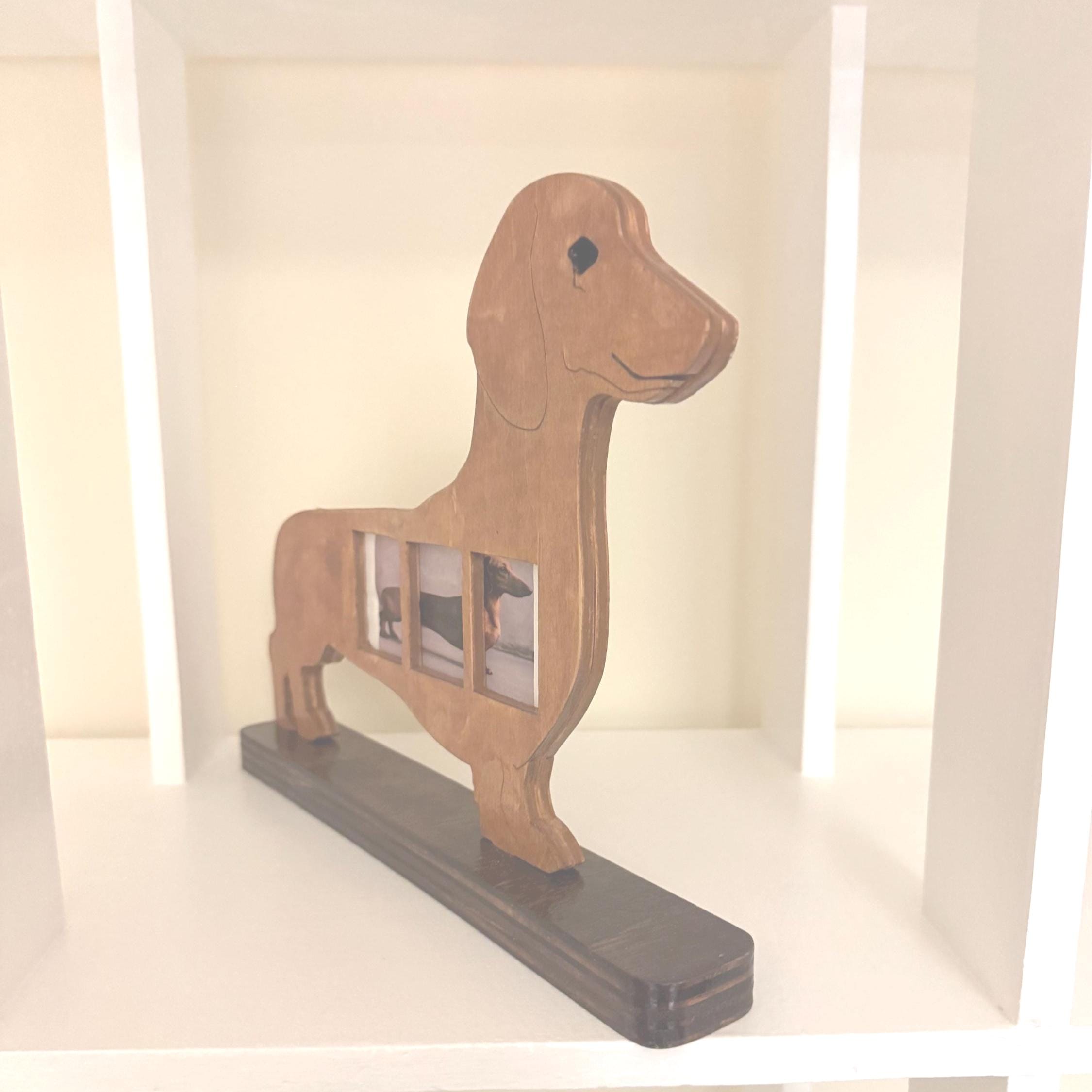 Each piece is hand cut, layered, sanded, stained, and finished by hand, making every frame slightly unique. The dachshund body holds three photos, allowing you to create a continuous image of your dog or display favourite moments side by side.