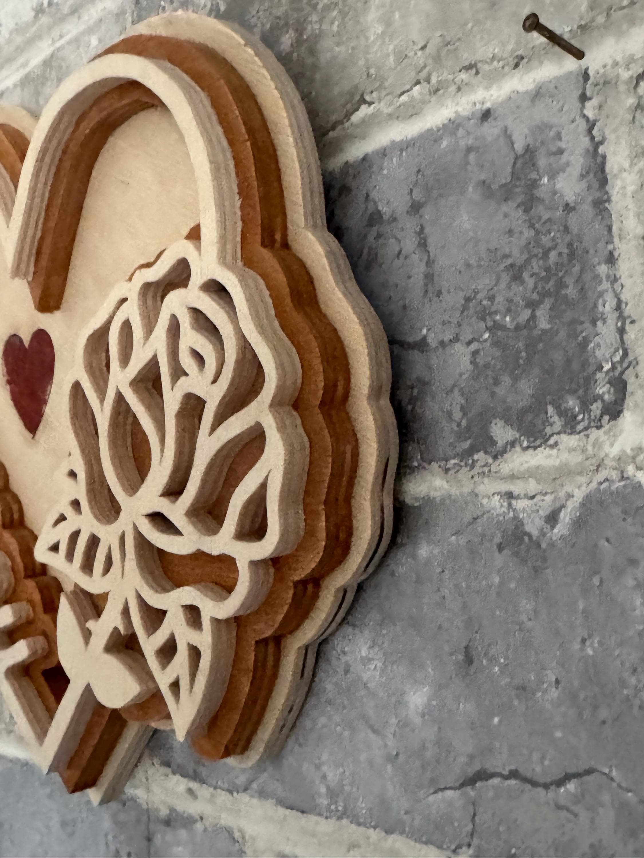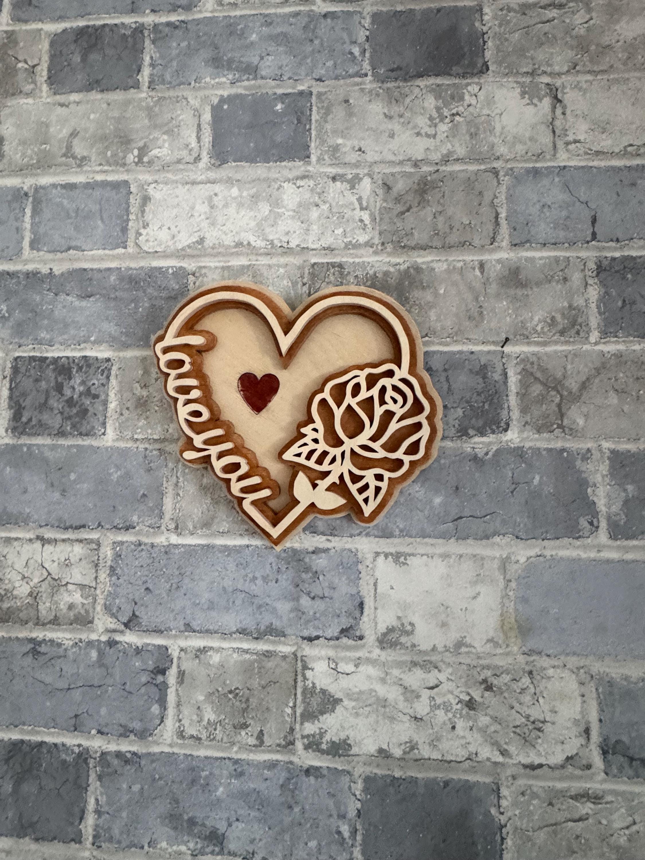 This decorative wooden heart is individually scroll-sawn by hand and carefully layered to create depth, contrast, and a premium finish. The flowing “Love You” script is paired with a detailed rose design, making it a meaningful gift for anniversaries, Valentine’s Day, weddings, or simply to show someone you care.