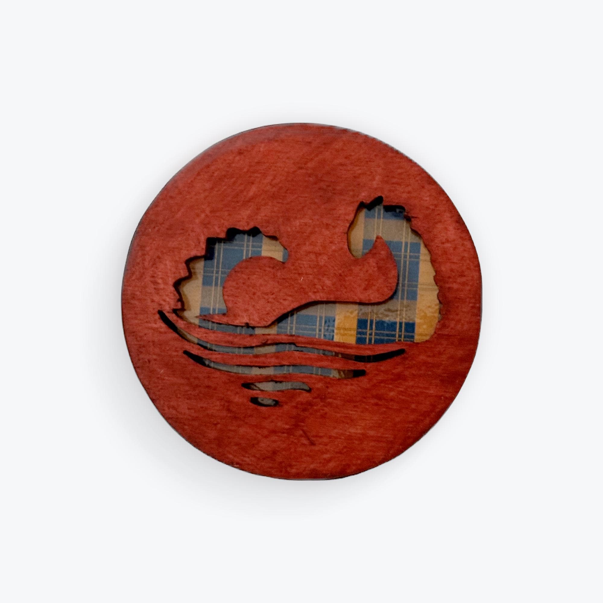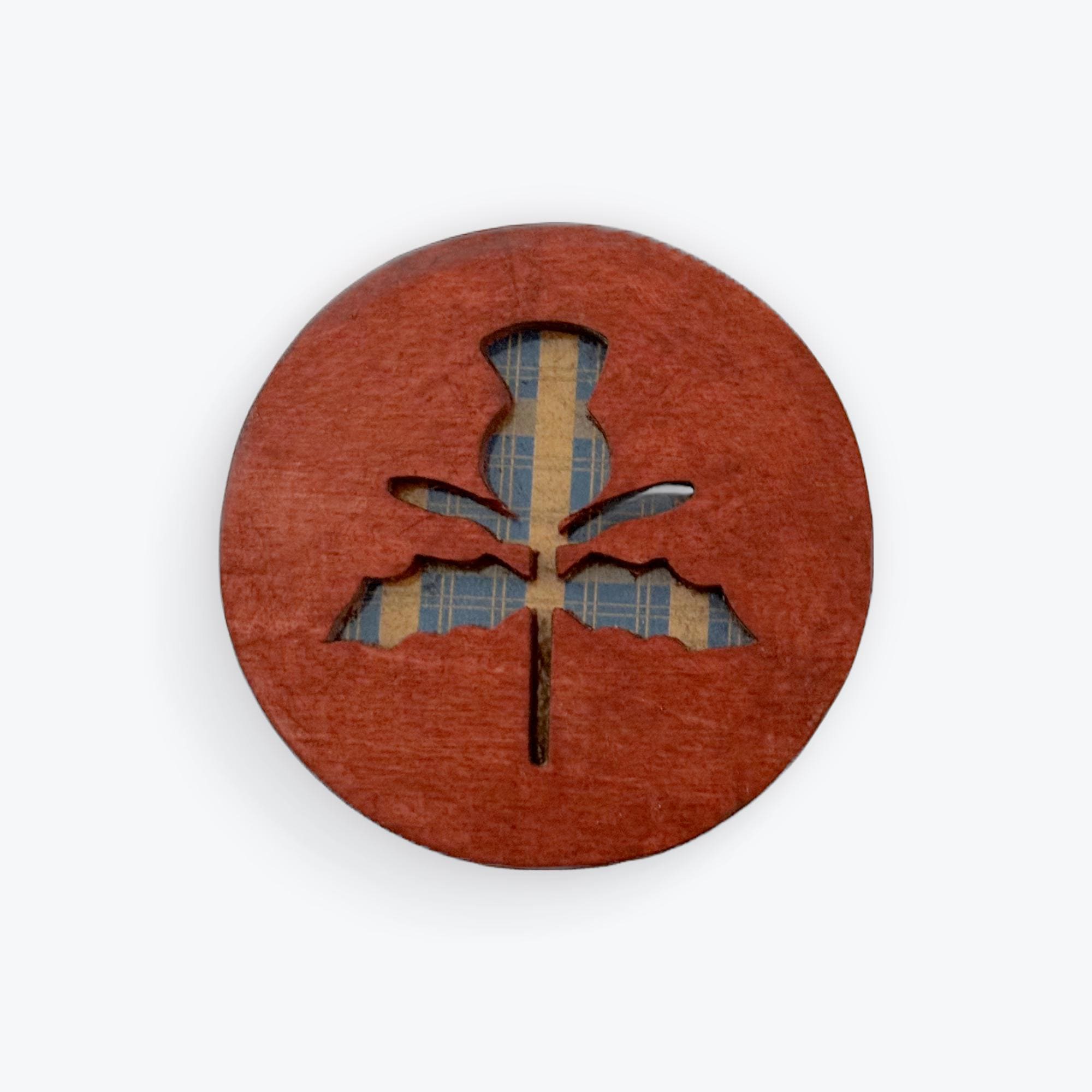 Handcrafted circular wooden coaster / plaque featuring a detailed Scottish Thistle cut-out with a laminated custom tartan insert at the centre. Each piece is made from layered Baltic Birch plywood, stained in a rich teak or Cherry Red finish to highlight the natural grain and give a warm, traditional look.